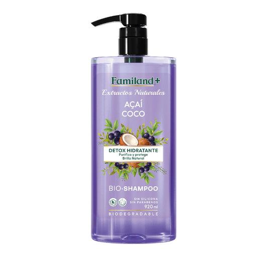 FamilandShampoo Familand + 920ml Acai coco Bio Shampoo Efectos Detox hidratante Purifica y Protege Brillo Natural Biodegradable Sin Siliconas Sin Parabenos